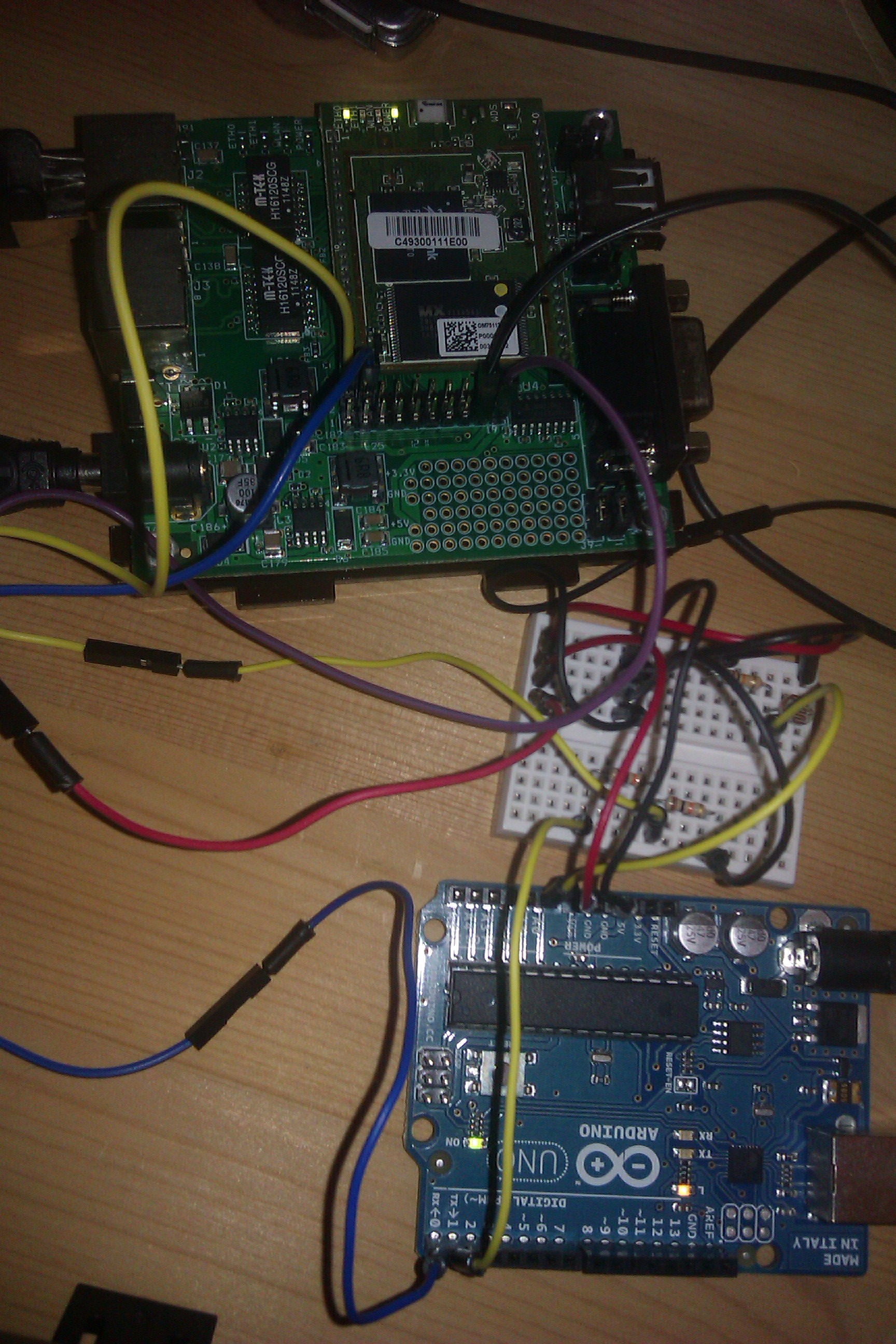 The OpenWRT board is a Carambola, about which I already wrote several posts in the past couple of years: it is a MIPS board with 32 MB of RAM and 8 (!) MB of Flash disk, plus several I/O pins (but no PWM), two Ethernet ports and a WiFi chip; in the photo it is shown with its dev board (the Carambola itself is the smaller piece with the two leds in the upper part of the photo). The microcontroller board is simply an Arduino Uno (rev2).