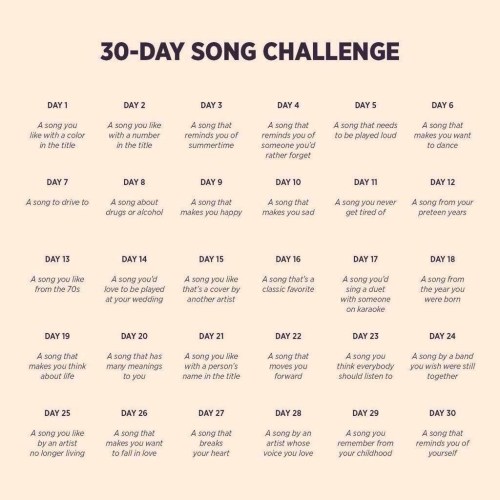 Un mese fa ho incrociato quest’immagine su Twitter, ed ho deciso di seguire la challenge per i successivi 30 giorni, pubblicando le canzoni su Facebook.
