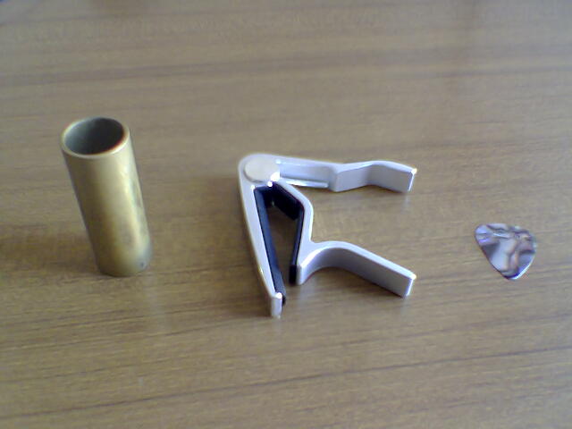 Ecco il corredo del buon chitarrista: non è spettacolare il capotasto mobile (che io continuo a chiamare barré, come si chiama la medesima azione fatta con l’indice della mano sinistra… deformazione professionale) della Dunlop?